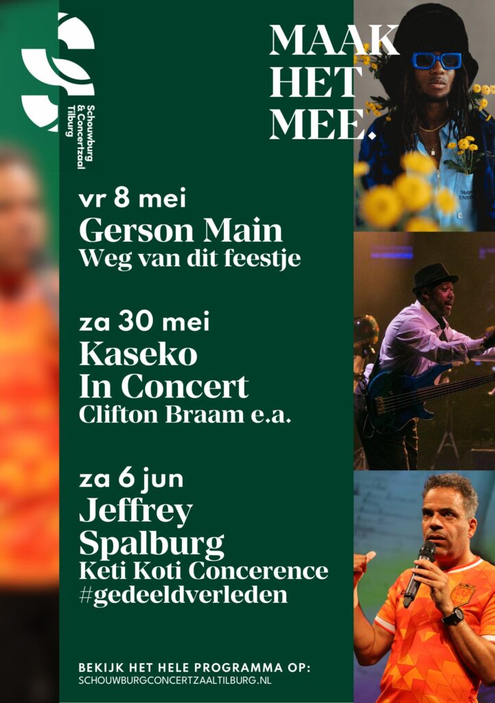 Activiteiten, NieuwsInteressante voorstellingen in Schouwburg Tilburg Geplaatst op april 20, 2026april 20, 2026 door Stichting 2gether 20 apr Meer infomatie en ticketverkoop: Gerson Main & Productiehuis Mozaïek Kaseko in Concert Jeffrey Spalburg, Keti Koti Concerence Stichting 2gether In de multiculturele samenleving die Nederland is, heeft stichting 2Gether het doel een positieve bijdrage te leveren aan de invulling van het woord samenleving. Samen leven is samen functioneren. Bijeenkomst subsidie aanvraag project Slavernijverleden Busreis Amsterdam – Bezoek Surinaams Museum